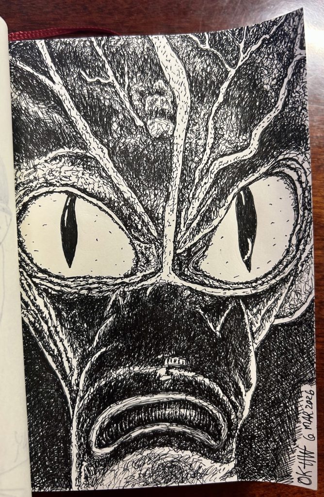 I love sci-fi movies, particularly old cheesy ones from the 1950s. There is an innocence and sweetness to them that is comfortable as an old pair of slippers for me. One of my favorites is “Invasion of the Saucermen” from 1957 because it really delivers on the classic saucermen action, unlike many movies of that era where you might get a quick glimpse of the creature once or twice at the end, or they overexpose the badly designed and created aliens too much. This movie has superbly designed aliens that went on to influence the 1962 Topp’s collector card series “Mars Attacks”, which was the basis for Tim Burton’s 1996 movie of the same name. So, let’s get to this week’s drawing, of one of the saucermen…