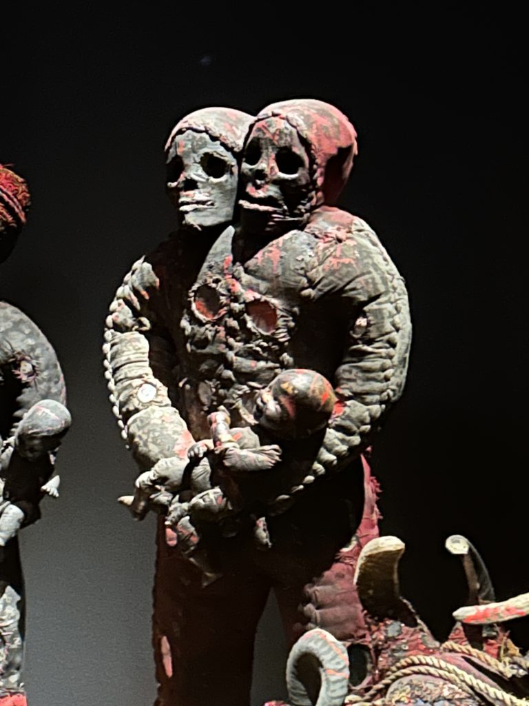 This is a voodoo ritual fetish shadow figure that I saw at the incredible Musēe de Confluence in Lyon, France in an exhibition called “Zombis aux origines”. One section of the exhibition featured a dozen of these figures that had been used in actual voodoo rituals. The red you see randomly splashed on the figure is wax and/or dried blood (probably animal’s blood…). The skulls are real human skulls. I can’t imagine who sat quietly assembling this creature, what must have been going through their mind and where did they get the skulls? There are little round mirrors sewed in to the weird suit to deflect hexes and spells, and what’s up with the creepy baby doll it’s holding? I have to admit, I hesitated before I took the photos (I have more, but will dole them out over time) because these things are spiritually intimidating. I mean, I didn’t want any of that bad Ju-Ju following me home.