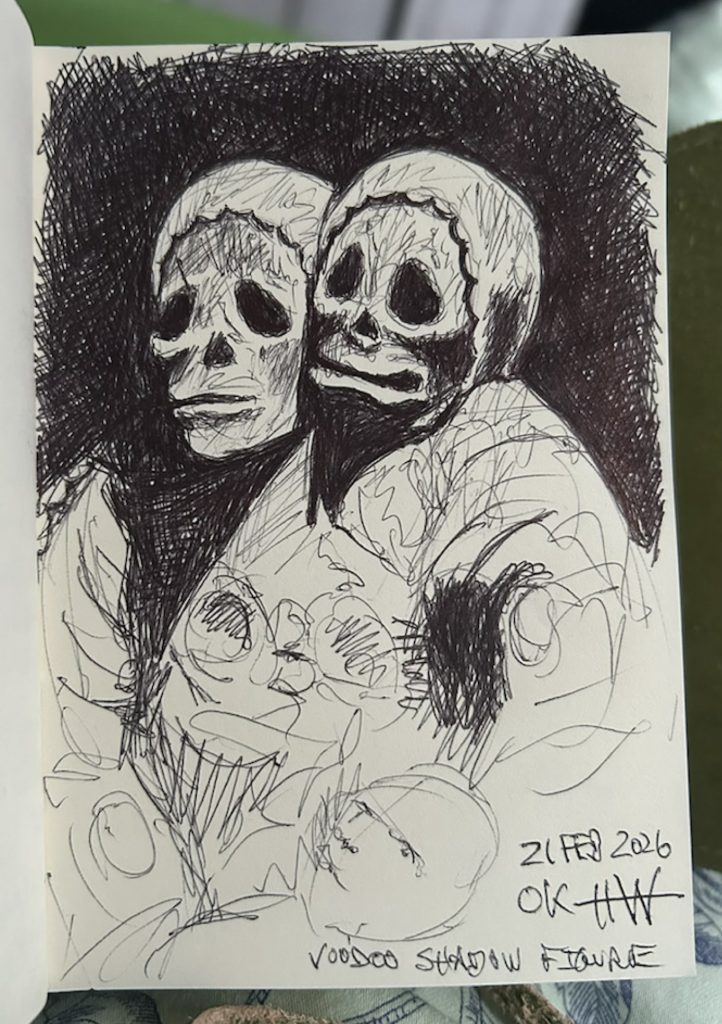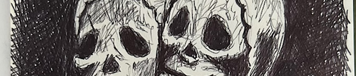 Yeah, it may look half finished, but for me, this one is done. When I’m drawing with a ball-point pen, as I did here, I sometimes like to see the rough, scribbly under drawing. I do reserve the option to touch it up later when it’s hanging in a museum (yeah, right), but more likely, I’ll just take another run at this subject sometime. And what the hell is that anyway? Some weird two-headed skull, demon creature? Yes, yes it is and I was drawing from a real world reference, a photo I took myself.