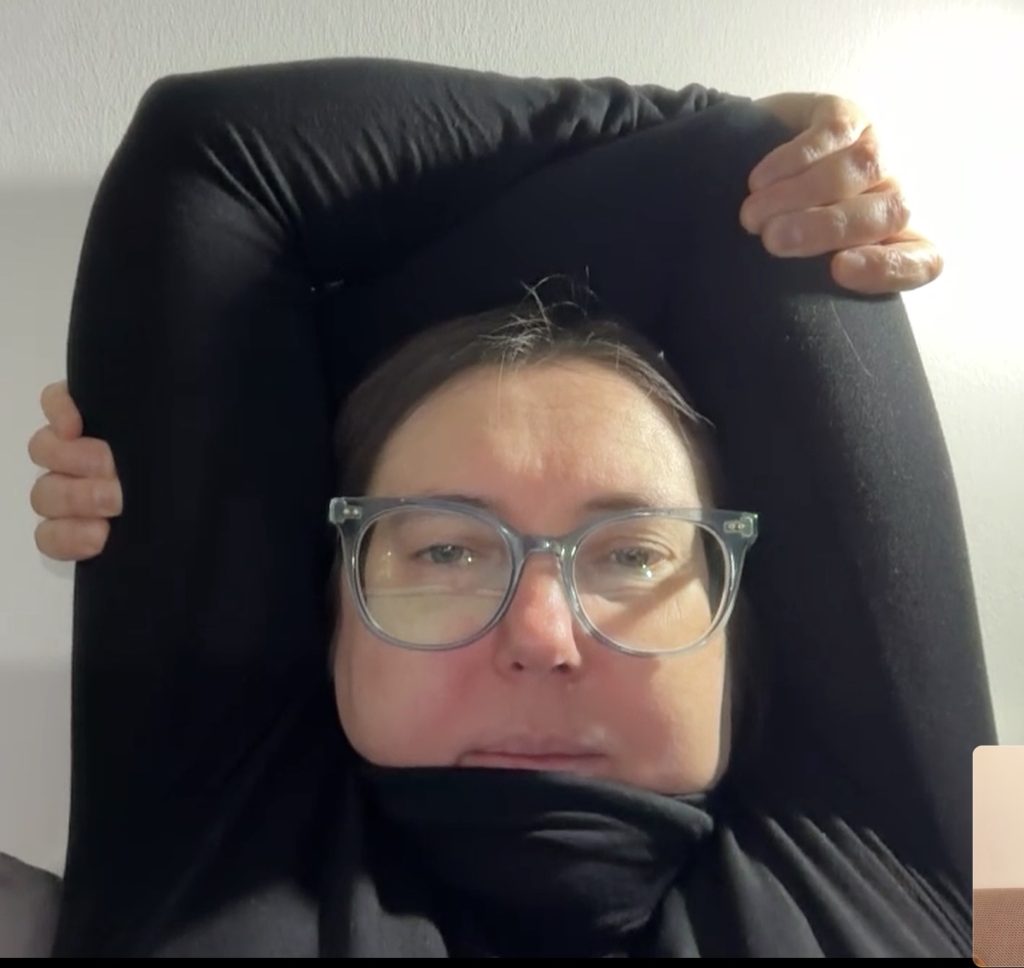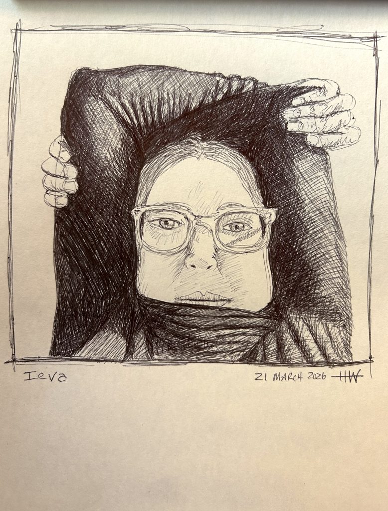 In the recent call, when I saw Ieva frame her face with her black-clad arms in our video chat, I immediately knew that I had to draw her. There was something about the composition and the serene look on her face that I wanted to capture. I got a couple of screengrabs, but I wish I had taken more. I liked how she was hugging herself; a long-distance hug I wanted to give her in that moment.