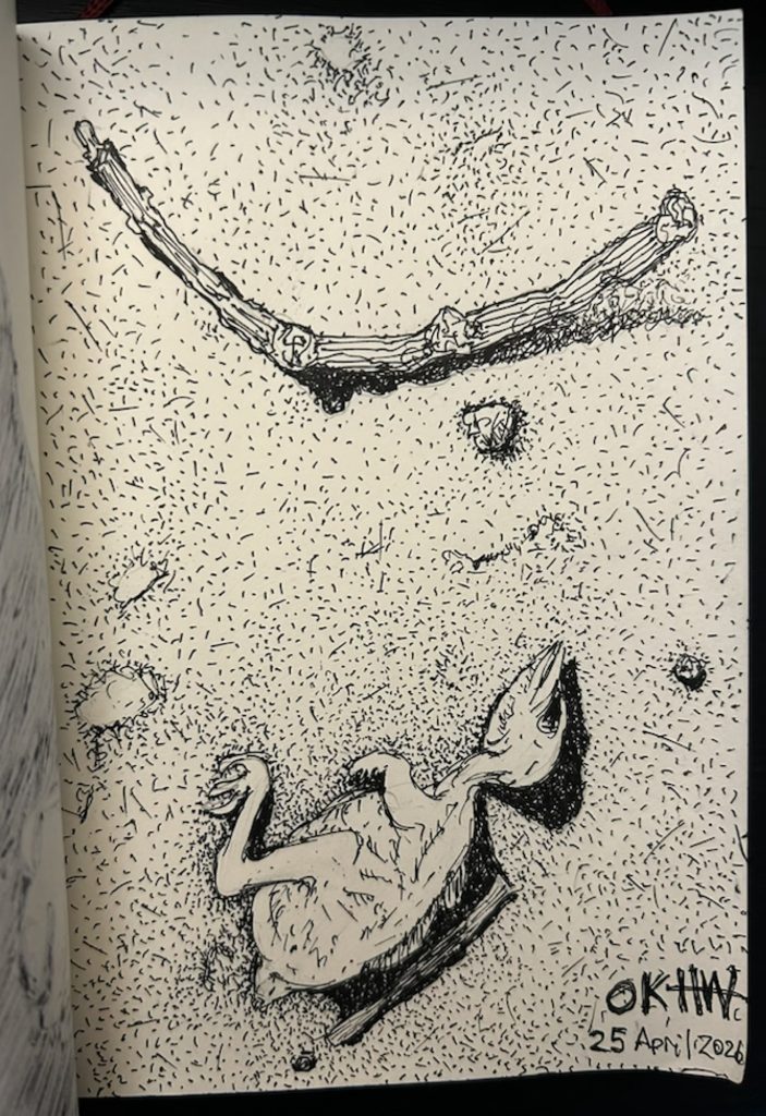The poor little dude didn’t have a chance; never will get to fly. Nature is cruel. There are no excuses or undo’s. We humans generally walk around feeling like we are immune to the harsh whims of nature, or maybe, if it does happen, it’ll affect someone else. The samurai would “freshen their mind with death” every morning as a reminder that life is a brief and fragile gift. All of this was on my mind as I made my drawing.