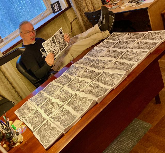 It’s been 35 years since I last put out an issue of RELUCTANT SADIST. The world is a very different place since 1989, I don’t have to tell you. Between the internet and social media alone, it’s a weird new world. I chose to continue with producing a print version of the comix as I was doing before; same size, digest-size, a folded sheet of letter or A4 size paper because I want to hold something, other than a smartphone, in my hands. A physical object, particularly a book creates a space in reality that digital never will. I like the idea that these zines could be around for centuries, traveling around from one person to another or forgotten in a box only to be discovered some decades later. I can’t fall into a story told digitally like I can when it’s printed on a paper. There’s no touch or smell, no familiar smudge or corner torn or folded like a printed copy provides. The physical is just more, well, real, so it was worth the effort and cost to have the comix properly printed.