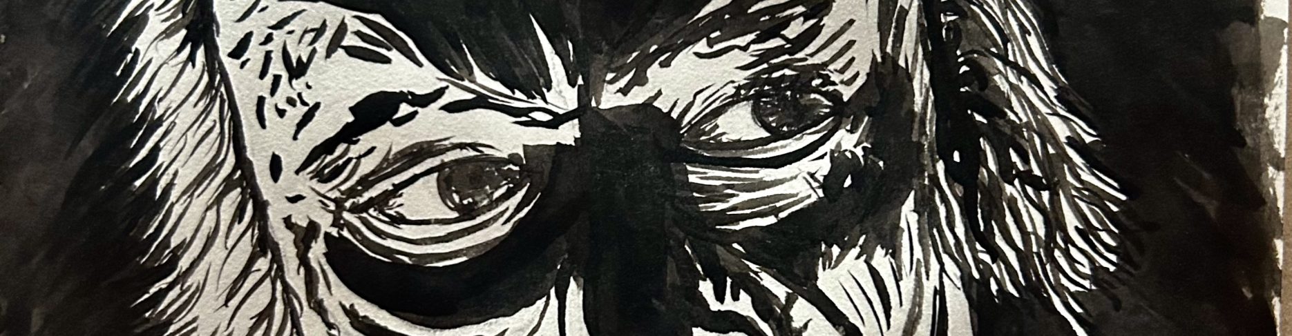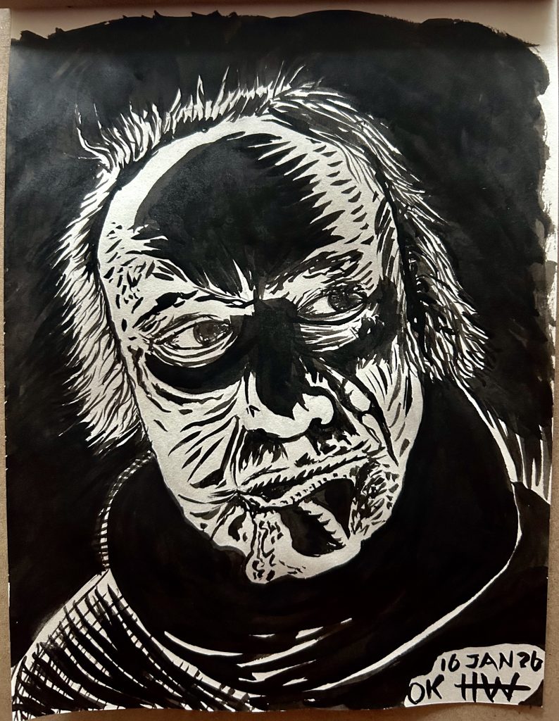 I love the bold lighting; classic horror movie lighting from below. I choose this image because it also made me think of Francis Bacon paintings; all that texture in the face. Thos strong shadows also brought Jack Kirby’s style to mind, so I went forth with brush and ink to try and get some of that flavor. I like the results, but I think I’ll take another run at this one some time with ballpoint pen so I can get all of those juicy tiny details in there. Here is my version…